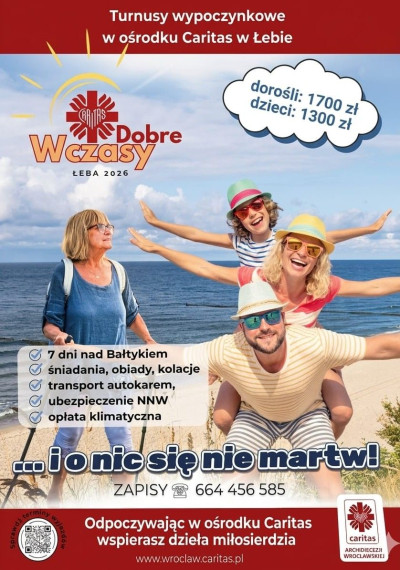 - Caritas Archidiecezji Wrocławskiej zaprasza na 7-dniowe wczasy w Łebie. Zapisy i szczegóły pod numerem telefonu 664-456-585. Plakat z informacjami znajduje się w gablocie i na stronie parafialnej.
